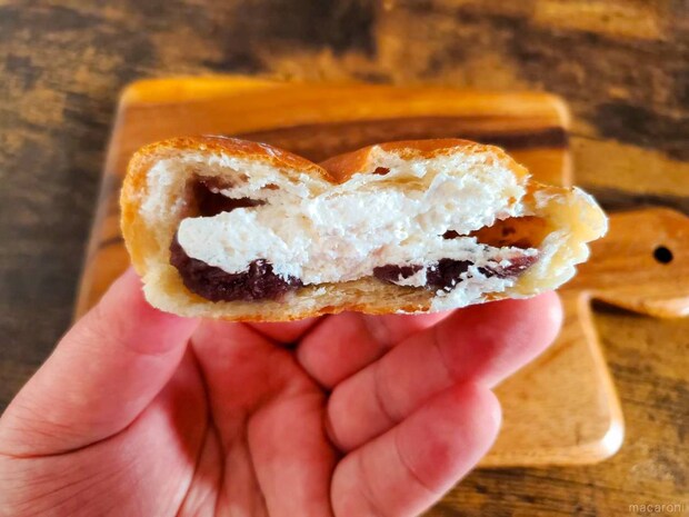 半分に割ってみると、ホイップクリームとこしあんがぎっしり。ひと口頬ばると、ミルキーなコクとこしあんのやさしい甘みが重なり合い、どこかほっとする味わいが広がります。