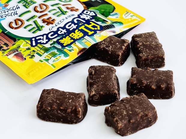 「きのこの山」のカリッとしたクラッカーと「たけのこの里」のサクッとしたクッキーを砕き、ミルク風味のチョコや小麦パフと合わせてバー状に成型。さらに、まわりはビターチョコでコーティングされています。