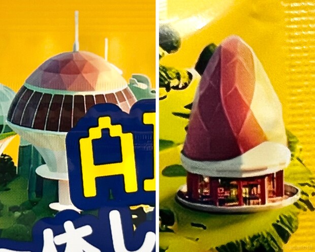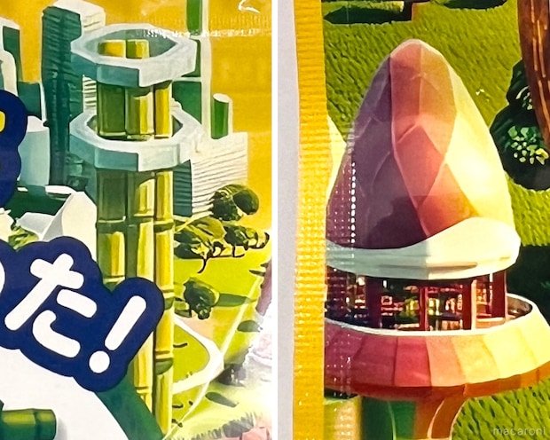 ユートピアのような不思議な世界観で、よく見るときのこやたけのこの形をした建造物もちらほら。