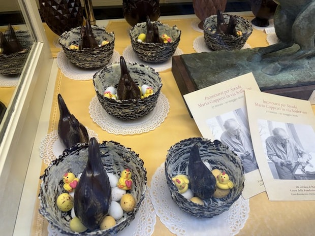 Pasqua(=イースター)前のショーウィンドウには、チョコレートで作られた卵が並んでいて、道行く人が立ち止まり見入っていました。