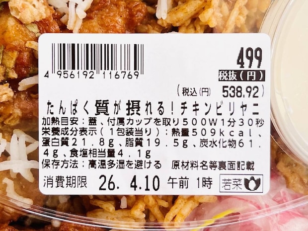 「たんぱく質が摂れる!チキンビリヤニ」という商品名で販売されている本商品。ビリヤニというだけでも珍しい存在ですが、さらにたんぱく質までカバーしているとは……。価格は税抜499円(税込538.92円)で、ほぼワンコインという手頃さが魅力です。