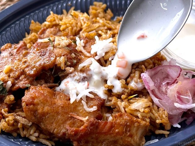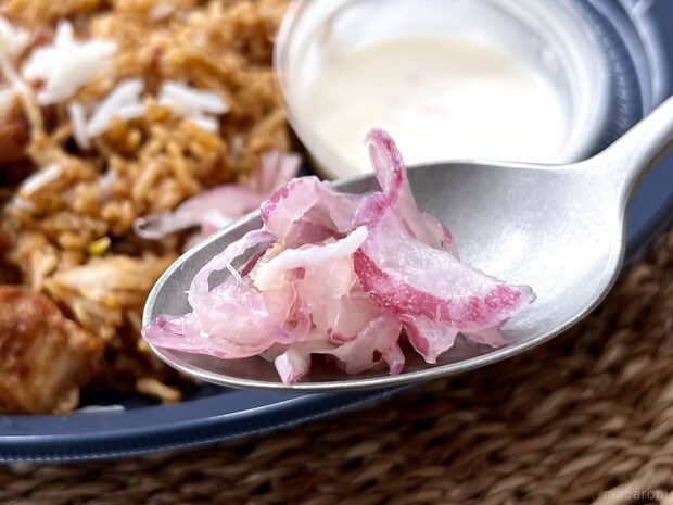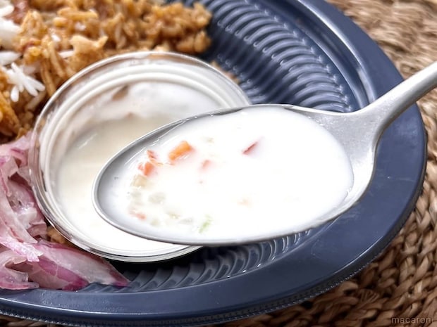 ライタはヨーグルト仕立てのさっぱり味で、ヒリヒリとした口の中をやさしくリセット。細かく刻まれた玉ねぎやにんじんなどが入っており、食感のいいアクセントにもひと役買ってくれます。