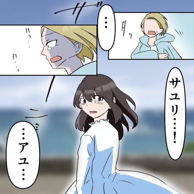 そして海辺を探しているとサユリの姿が見え、「サユリ・・!」そう声をかけると、海を眺めて立っているサユリが振り返り「・・アユ・・」と呟きました。