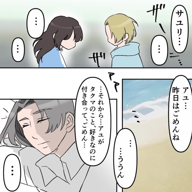 すると、「アユ・・昨日はごめんね」サユリにそう言われ、「・・ううん」そう答えると、「・・それから・・アユがタクマのこと、好きなのに付き合って、ごめん・・」サユリの言葉を聞いてすぐには何も言えなかった私に、