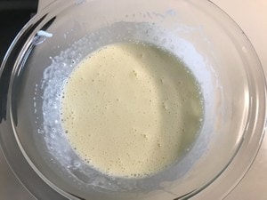 レンジで加熱したボウルを取り出し、ダマにならないように混ぜ合わせる。