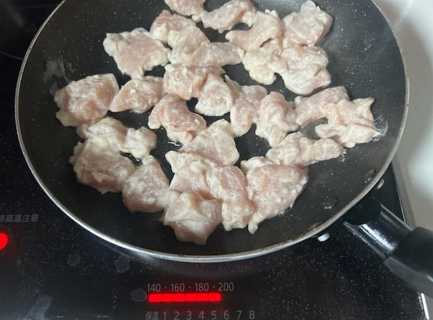 フライパンに油大さじ2を熱し、鶏肉を並べて、強めの中火で加熱する。