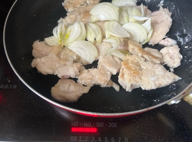 薄力粉大さじ2をまぶした鶏肉を、油大さじ1を熱したフライパンに並べ入れて強めの中火で加熱する。片面に焼き色がついたらひっくり返し、弱めの中火にしたら薄切りした玉ねぎ1/2個分を加え、軽く炒めてからフタをして蒸し焼きにする。