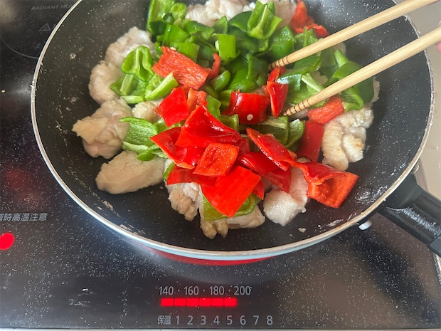 薄力粉大さじ2をまぶした鶏肉を、油大さじ2を熱したフライパンに並べ入れて強めの中火で加熱する。片面に焼き色がついたらひっくり返して、種を取り除いて乱切りにしたピーマン8個分を加え、軽く炒める。