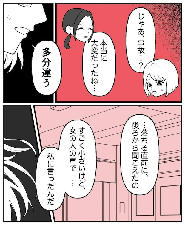 階段の踊り場から、誰かに突き落とされたという友人。しかし、誰もいなかったそうです。不可解な事故ですね…。