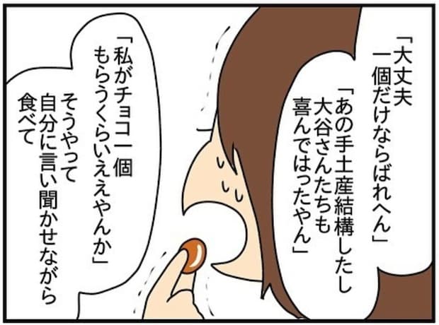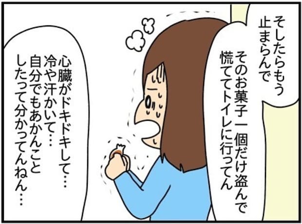 衝動を抑えることができず、お菓子を盗んでトイレに駆け込み、大丈夫と自分に言い聞かせて口に運びます。