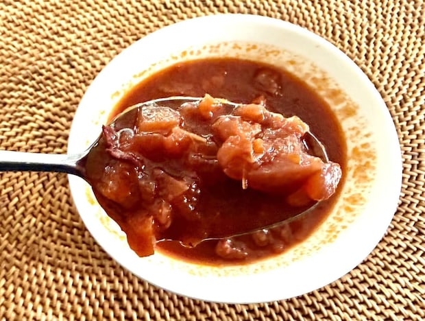 光沢のある濃い赤色のソースと、ゴロッと見える肉の塊。食欲をそそる存在感を放っています。