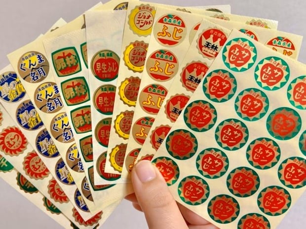 まさかの「りんごの品種」シール。スーパーでよく見かける、小さくてカラフルでちょっとツヤっとしたあの丸いシールです。いろいろな種類があってかわいいですね。