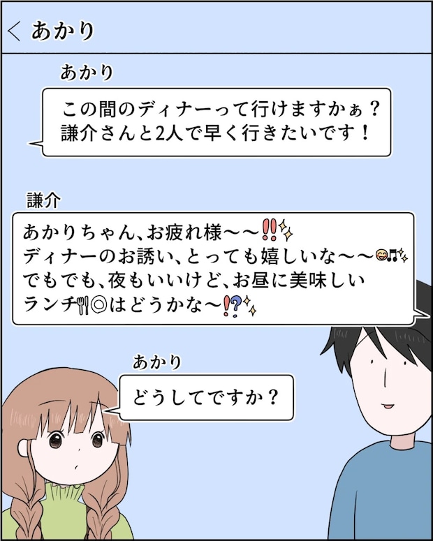 謙介「あかりちゃん、お疲れ様~!ディナーのお誘い、とっても嬉しいな~~。でもでも、夜もいいけど、お昼に美味しいランチはどうかな~?」
