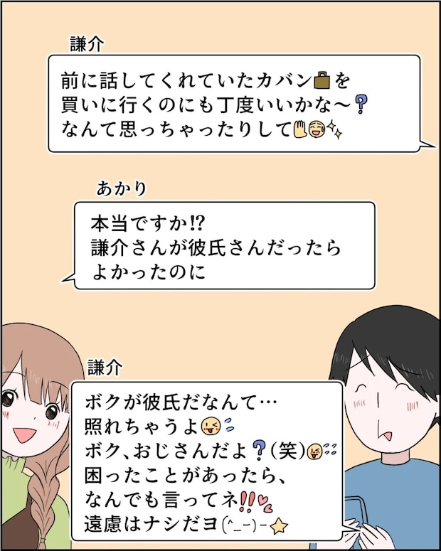 謙介「ボクが彼氏だなんて・・照れちゃうよ。ボク、おじさんだよ?(笑)困ったことがあったらなんでも言ってネ!遠慮はナシだヨ(ウインク)」