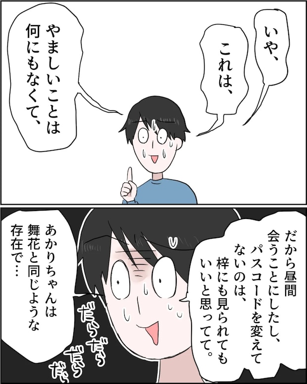 きっちりおじさん構文を晒された謙介さんは内心大慌て。「いや、これは、やましいことは何にもなくて、だから昼間会うことにしたし、パスコードを変えてないのは、梓にも見られてもいいと思ってて。あかりちゃんは舞花と同じような存在で・・」と取り繕おうとしてしゃべりすぎる典型のようなリアクションをする謙介さん。