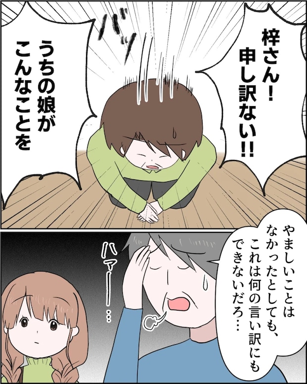 すると、「梓さん申し訳ない!!うちの娘がこんなことを」と土下座する叔父さん。義父も「やましいことはなかったとしても、これは何の言い訳にもならないだろ・・」と頭を抱える始末。その横で訳も分からずキョトンとしているあかりさんの姿がありました。