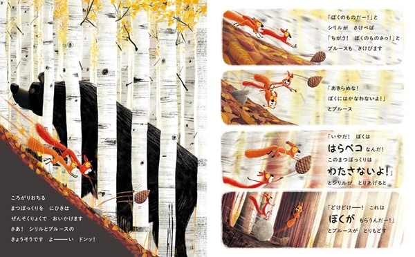 冬眠の季節が近づいて、森の仲間たちが冬支度をしている頃、リスのシリルとブルースは、とっても美味しそうな今年最後のまつぼっくりを見つけた。二匹は自分のものにしようと、まつぼっくりを求めて木々の間を抜け、岩を越え、川を下って、取り合い競争する。そんな欲張りなリスたちに予想外のハプニングが待ち受けていた。大ピンチのシリルとブルースは、そこでようやく、大事なことに気づく。分かち合うこと、友情の大切さを描いた物語だ。