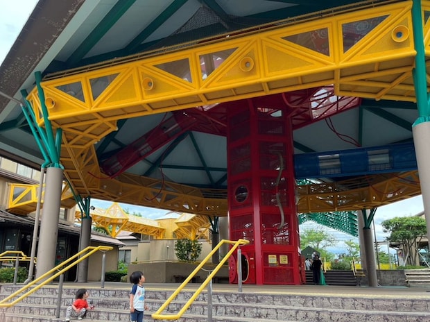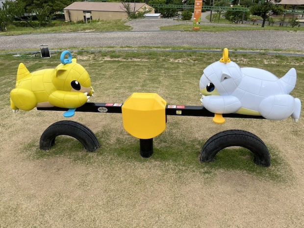 とっとりふるさと大使のポケモン「サンド」と「アローラサンド」がお出迎えする砂場には、砂場用のおもちゃもあり、お砂場セットを持っていかなくても楽しめちゃう!