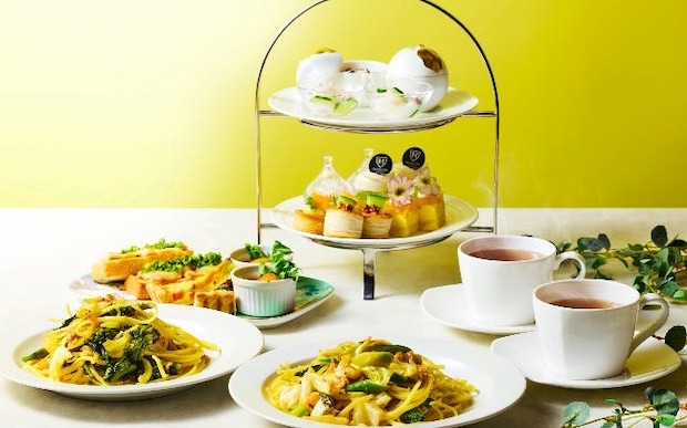 ディナータイムには「THE BAR」にて、WEB予約限定で同テーマのイブニングハイティーを提供。アフタヌーンティーでの提供メニューの「メロンのプリンアラモードパフェ」が「月替わりのおすすめパスタ料理」に代わり、お食事としても満足感のあるボリュームに。5月は「桜海老と春の野菜 レモンパスタ」。春の食材をたっぷりと使用した爽やかな風味を堪能してみて。