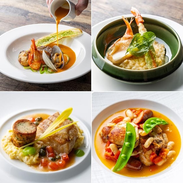 海の恵みを味わいたいなら、特大のアサリや北海シマエビ、高級魚クロソイが入った「北海道の魚介ブイヤベース」や、北海道産キンキの鱗焼きに、カニのベニエと、ウニのリゾットを合わせた贅沢な1皿を。