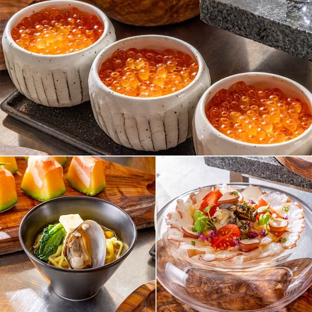 食べ放題の前菜には、宝石のように輝くいくらがたっぷりとのった「ミニいくら丼」がお目見え。うまみが引き立つホテル自家製の醤油漬けは、見た目も味わいも格別。