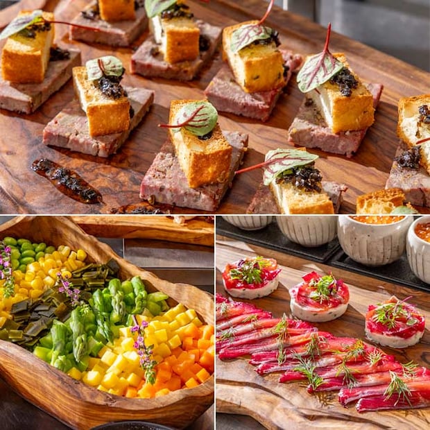 エゾシカのうまみが詰まったパテは、サクサクのフォカッチャとトリュフ香るハニーソースとともに。北海道産の昆布やアスパラガス、コーンなど栄養たっぷりの食材を使った「北海道コブサラダ」や、ラベンダーとビーツで鮮やかに彩られた北海道産トラウトのマリネも注目。素材の組み合わせが光る、コンラッド東京ならではの繊細な味わいを楽しんで。