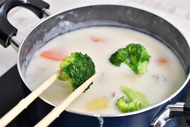 別茹でしたブロッコリーを加えるのは、「シチューがほぼ完成したタイミング」がベストです。