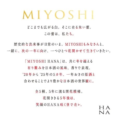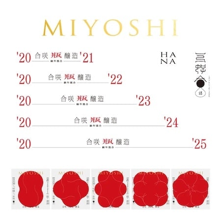 「MIYOSHI HANA」シリーズは、2020年を起点に、毎年その年に手がけた日本酒を丁寧に継ぎ、掛け合わせていく「合咲醸造」という手法を導入しており、年ごとの味わいと香りを表現した。