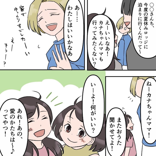 「〇〇さんち、今度の夏休み、ロッジに泊まりに行くんだって~」「えーいいなあ!カナちゃんママも行ってみたくない?」そう言われて、「あー・・わたしはいいかなあ。家でゆっくりすごしたーい」と答えると「えーそうー?」と口々に言うママ友さん達。すると、「ねーカナちゃんママ!またおうた聞かせてよ!」と娘の友達にそう言われ、「いーよ!何がいい?」私がそう言うと、「あれ!あの、愛のかたちは~ってやつ!」とリクエストされました。