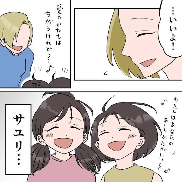 「・・いいよ!」私はそう答え、「愛のかたちはちがうけれど~」と子ども達も一緒に歌い出し、私はその声を聞いて「サユリ・・」とサユリのことを思い出さずにはいられませんでした。
