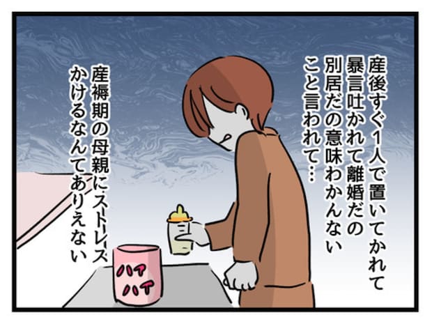 結局、赤ちゃんと2人で過ごすキリコさん。産後の身体で大変ですが、りょうじさんへの苛立ちが止まりません。