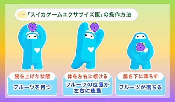 体を動かしてフルーツを落とすことで、楽しみながら運動習慣を身につけられる。なお、スイカゲームは、Aladdin X社により開発・提供されているコンテンツ。