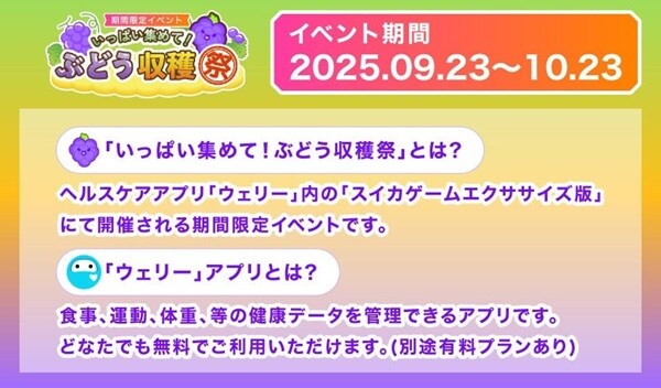 同イベントは、期間内にゲーム内で収穫したぶどうの数を競う特別ルールとなっており、上位の人には賞品として高級ぶどうを用意。運動習慣の定着とゲームを通じたコミュニティ盛り上げを目指す。