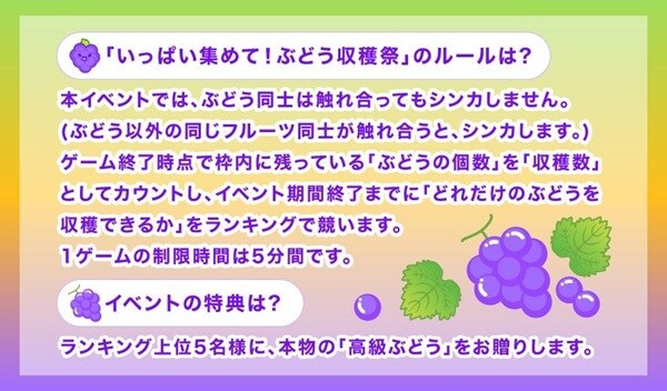 ぶどう収穫数上位5名に、高級ぶどうをプレゼント。イベント終了後7日以内にアプリ通知、登録メール宛に案内がある。開催期間は9月23日(火)~10月23日(水)。