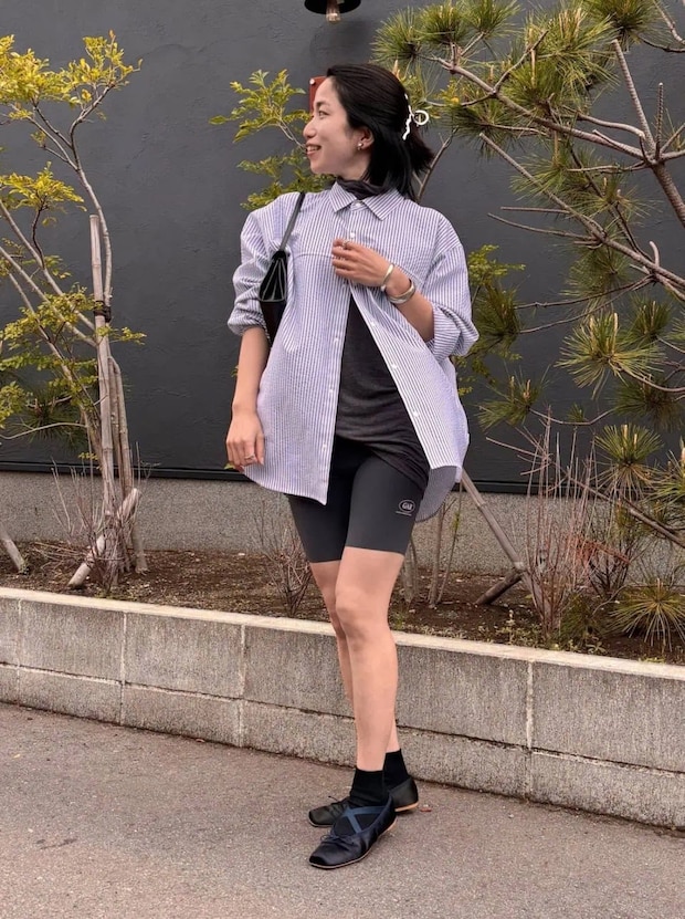 スポーティなショートレギンスが目を引くコーデは、ストライプシャツを織ることでシティムードに変身。足元のメリージェーンやレザーバッグでレディなエッセンスを忍ばせたのもポイント。