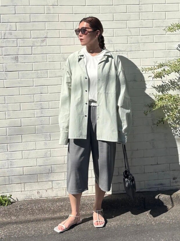 春らしく爽やかなグリーンのストライプシャツは、マニッシュなグレーのハーフパンツと好相性♥ 一見きちんと感のあるアイテム同士の組み合わせも、シャツをバサっと織ることで気負わないカジユアルスタイルに。
