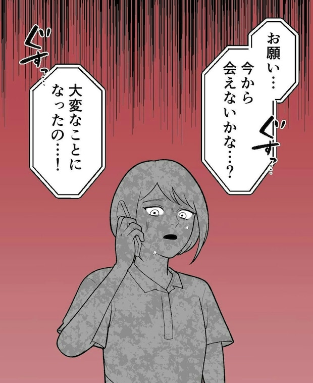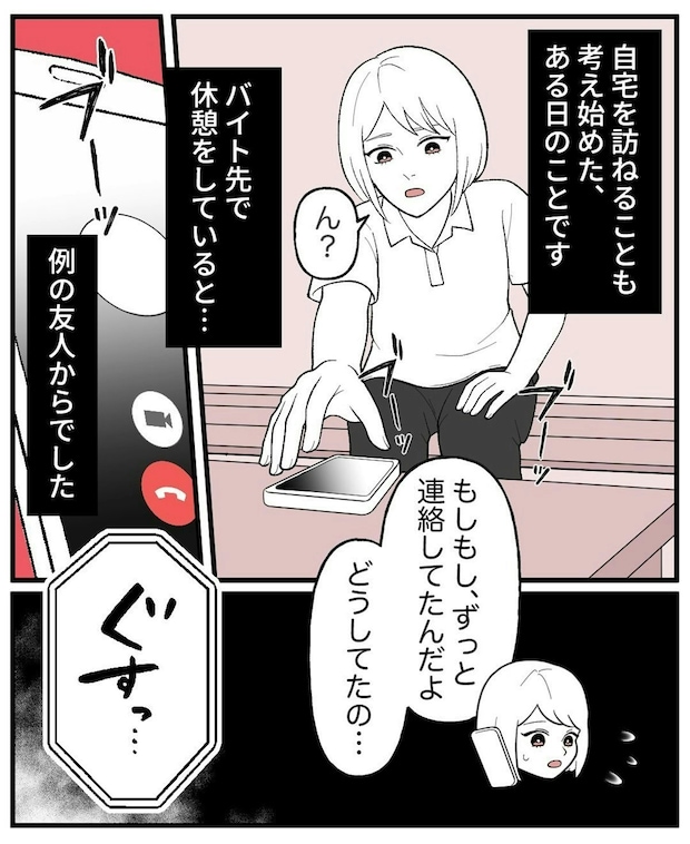 主人公が心配していたとき、友人から「大変なことになった」と連絡が来て、会うことになります。