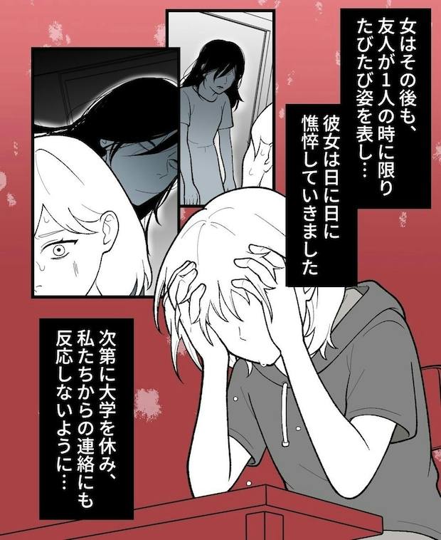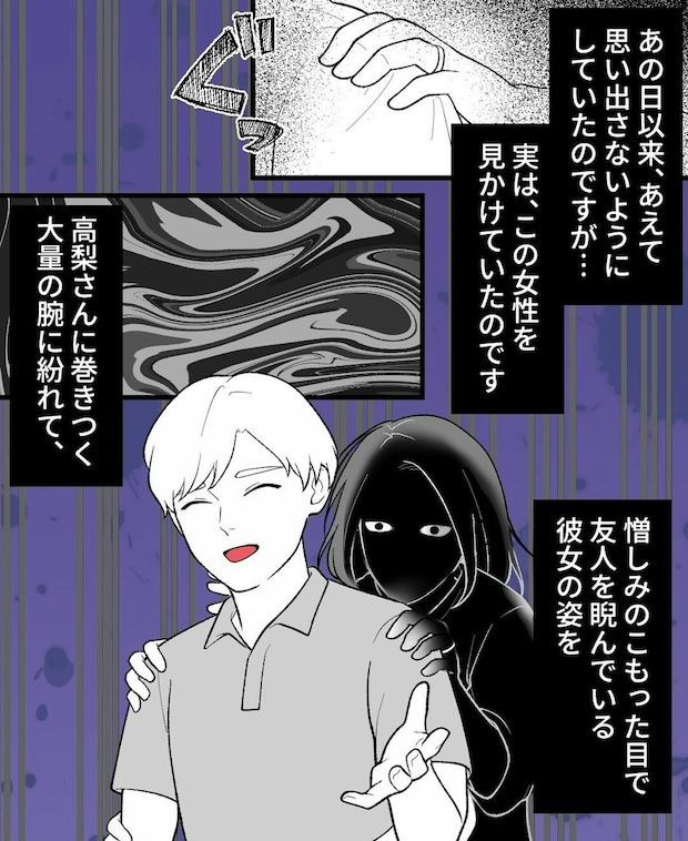 主人公の友人は、今の彼氏と付き合うようになったころから、次々と不可解なできごとに巻き込まれます。ケガをしたり、精神的に追い詰められる状況は、尋常ではありませんね…。