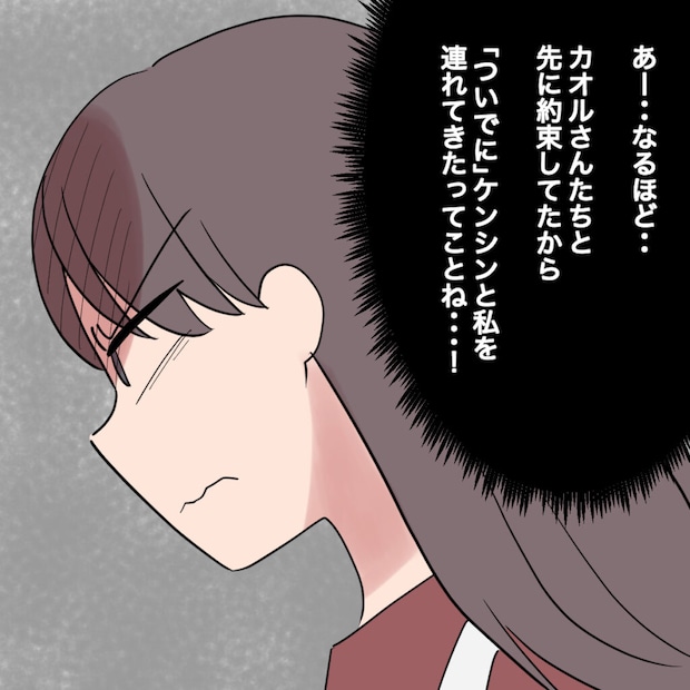 そして約束の日曜日。ケンシンは朝からウキウキです。駐車場に向かい「じゃあ出発・・」と車に乗ろうとした時、突然「ごめんごめん。遅くなっちゃった~」となぜかカオルさんとタイガくんが現れました。状況が飲み込めず「え・・」と固まっていると、「あーーー。今日はみんなで行こうと思って・・。いやぁ~、あはは」とシンジがヘラヘラ笑いながら言いました。「は?」私がそう聞き返すと、