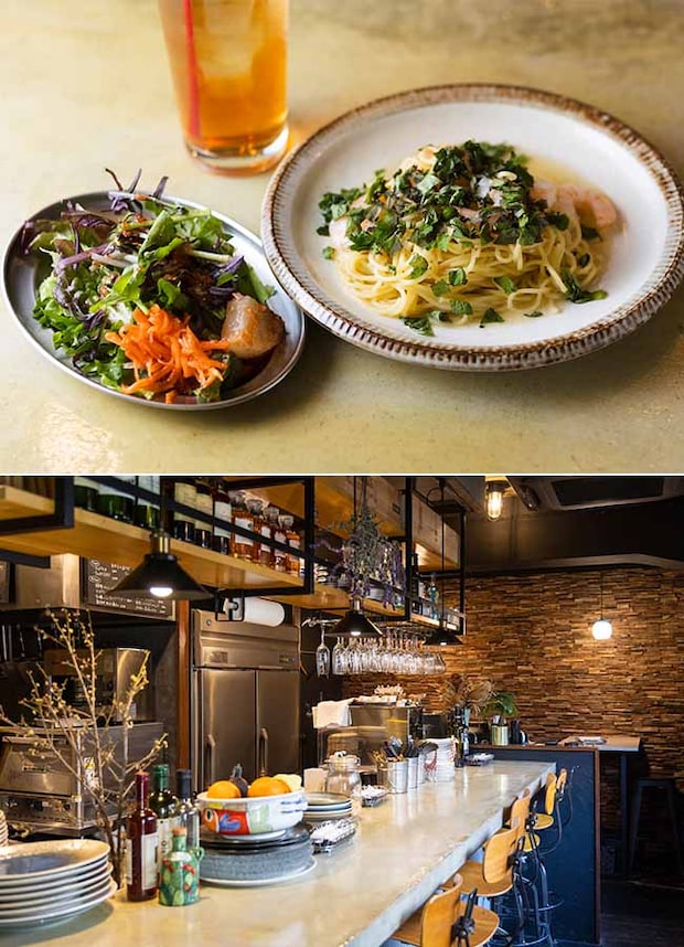 (写真上)青しそと小エビの和風ペペロンチーノは、自家製ドレッシングをかけたサラダ、ドリンク、手作りデザートが付いて1,350円/(写真下)存在感のあるL字のカウンターは厨房がよく見える特等席