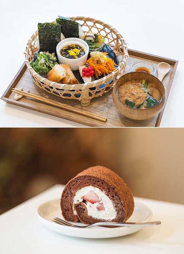 (写真上)ごちそう籠盛りランチはおにぎり2種類に揚げ物、おかず、汁物などが付く大満足のボリューム/(写真下)ロールケーキや焼き菓子などのデザートもすべて手作り