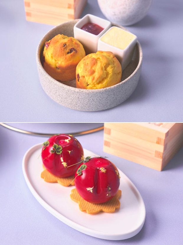 スコーンは、ドライクランベリーとマンゴーを練り込んだ季節感たっぷりの仕上がり。クロテッドクリームと甘酸っぱいベリージャムを添えれば、ティータイムの気分も最高潮に。