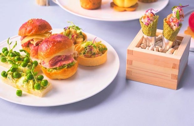 セイボリーには、食べ応えのある「和牛パストラミ・ミニバーガー」をはじめ、ブーケのような「スモーク鱒のリエット入りミニコーン」や、色鮮やかな「グリーンピースとリコッタチーズのオープンサンドイッチ」など、見た目にも春を感じる品々がラインナップ。京都の老舗「小川珈琲」のヒルトン京都オリジナルブレンドや、和紅茶など厳選されたティーセレクションとともに召し上がれ。