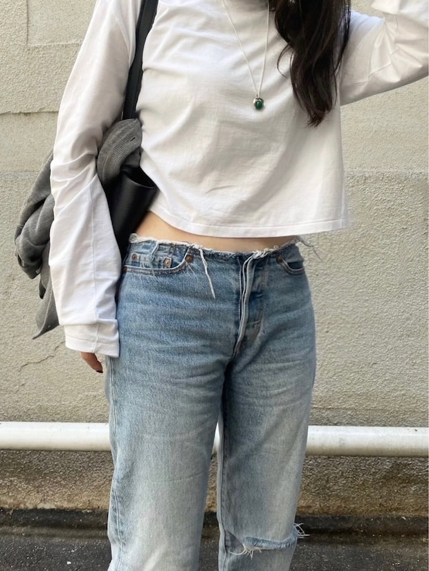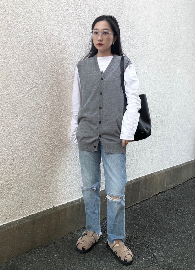 「トップはラフなロングスリーブにベストと合わせてシルエットをタイトに、ボトムはダメージが入ったデニムを合わせました。淡い色でまとめてトーンを統一して、ネックレスで差し色をプラスしています」
