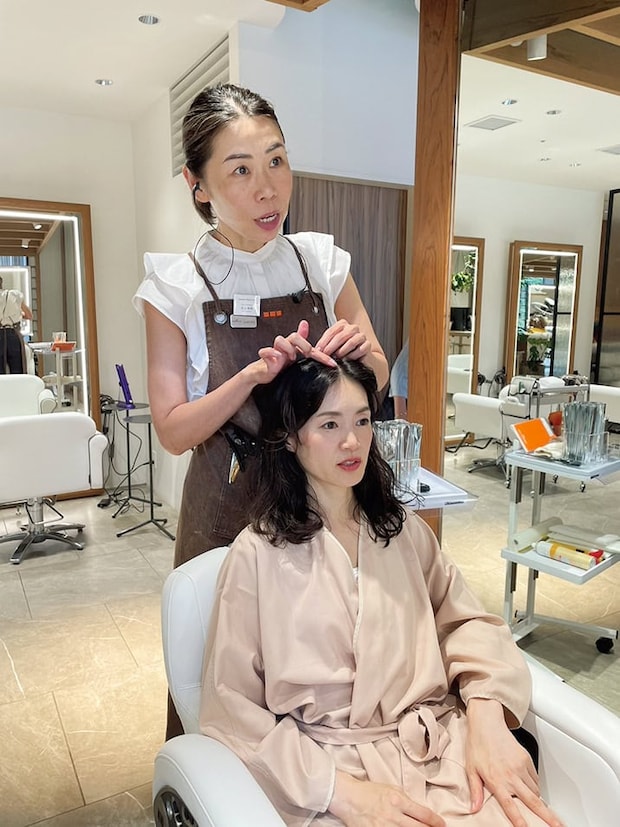 担当してくれたのは、カキモトアームズの岩上晴美さん。海外で技術を学び、日本初のカラーリストとして30年のキャリアを持つ業界のレジェンドです。20年近く髪を染めることから遠のいていたという鵜飼さん。地毛が黒いこともあり、つむじを中心に出てきた白髪が急に目立ってきたそう。とはいえ、そこまで量は多くないので、カウンセリングの結果、今回は全体にナチュラルブラウンのハイライトを入れて白髪と黒髪をなじませて目立たなく見せる「地毛ハイライト」を施すことに。