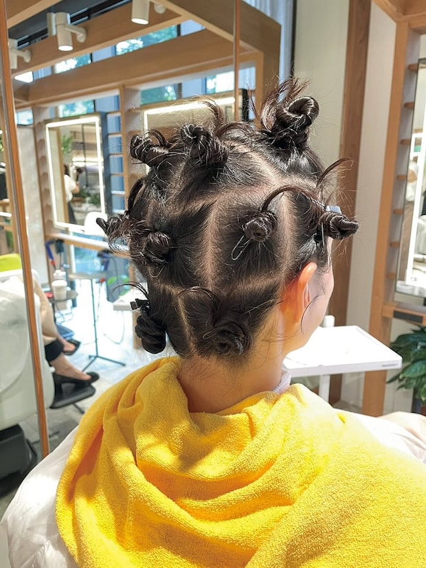 Y2Kを彷彿させるお団子スタイルですが、これがカキモトが誇る12に頭部をマッピングする「セクショニング」という方法。在籍する全てのカラーリストが習得している技術で、伸びてきた際に同じ場所に同じようにレタッチを施すための大切な工程なのだそう。