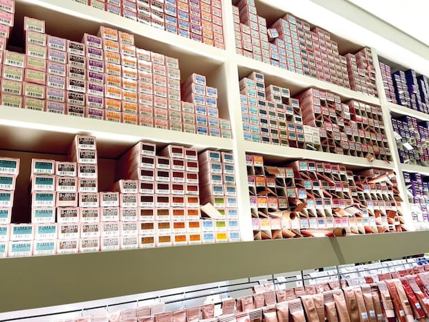 なんと約1,000種類のカラー剤の並ぶ棚。世界一の量だそうです。圧巻!