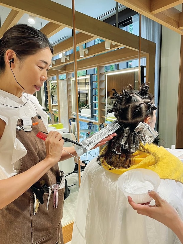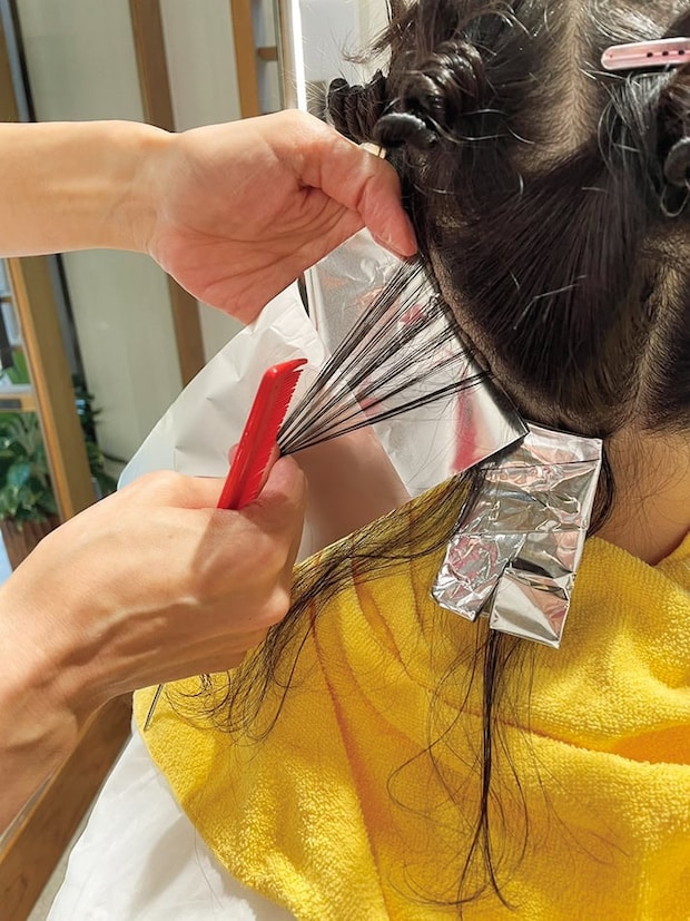 3で取った髪にカラー剤塗り、アルミホイルで巻いていきます。伸びてきたら、全く同じ場所の髪をすくって、その根元にカラー剤を塗ってレタッチします。スゴイ技術……。