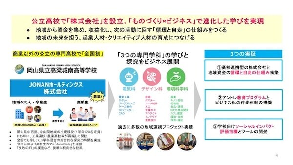 JONANホールディングスは、卒業生や地域住民が出資し、生徒が運営する。商品の企画販売、ワークショップやイベント企画運営、デザイン科のクリエイティブ力を活かしたデザイン制作などの事業を展開予定。ものづくり系の専門高校の高校生でも、経営・会計・マーケティングなどを実践的に学ぶ機会を得られるのが強みで、将来のキャリア形成、地域社会への貢献につなげていくという。