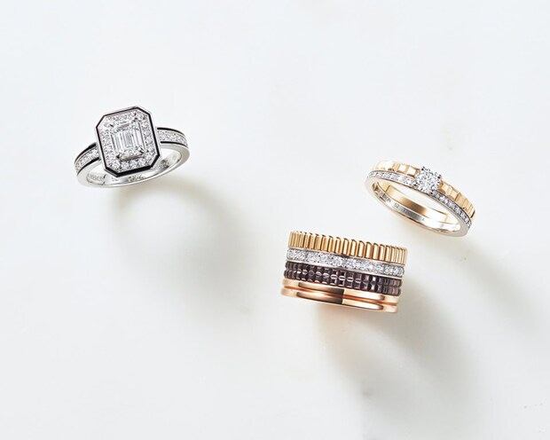 右上:〈キャトル〉[YG×WG×センターDIA0.3ct]¥819,500〜、右下:〈キャトル〉[YG×PG×WG×ブラウンPVD×DIA]¥1,544,400、左:〈ヴァンドーム リズレ〉[WG×センターDIA1ct×ブラックラッカー]¥4,369,200※全て予定価格(全てブシュロン/ブシュロン クライアントサービス)